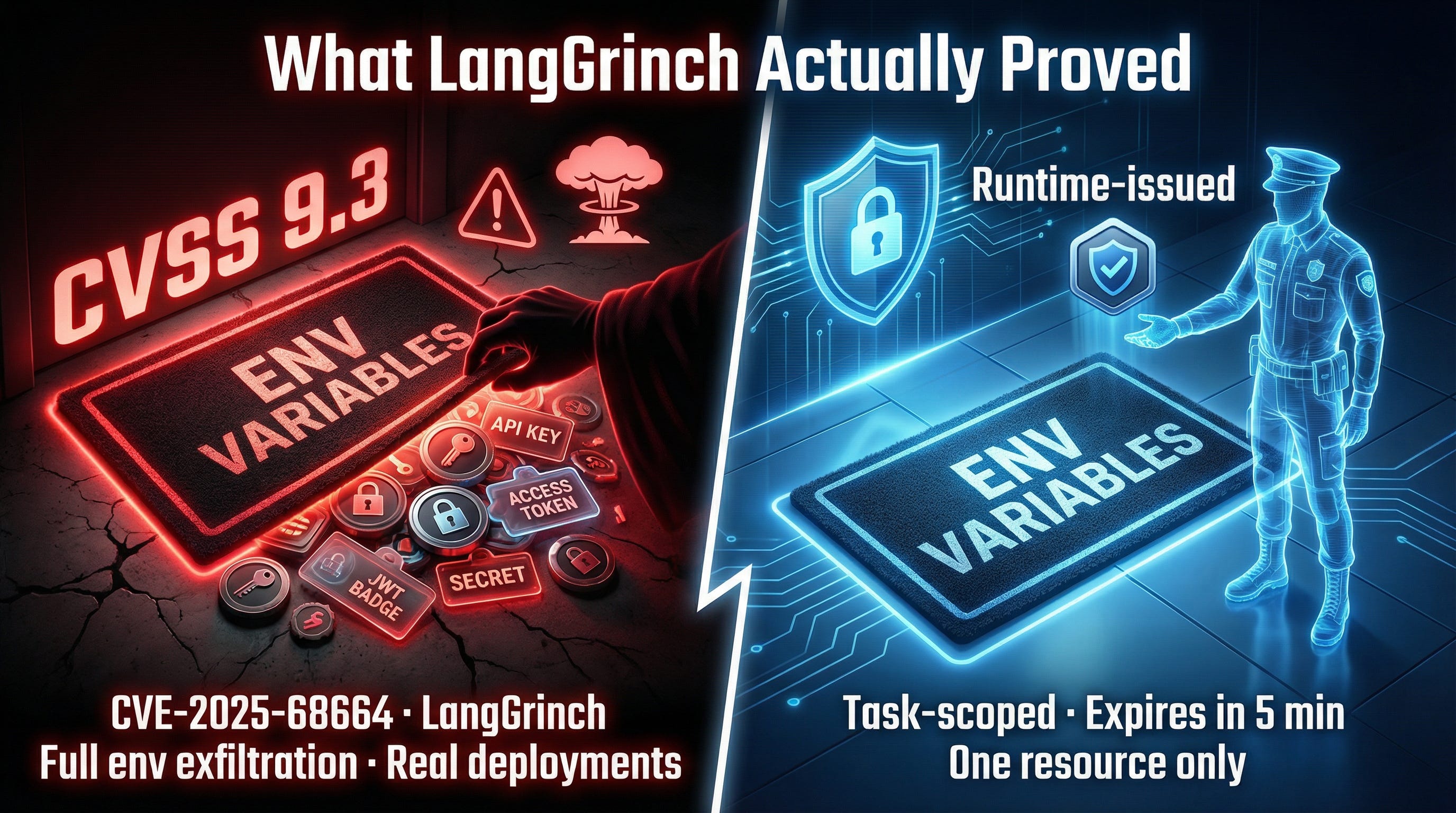 LangGrinch validated the core design principle in the most uncomfortable way possible: the industry was still storing long-lived secrets where agents could reach them, and someone showed the world exactly why that matters.
